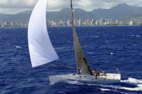 デザイナーズコメント <トランスパックレース> <ベンガル46>はトランスパックレース用に設計しました。 これはロサンゼルスからホノルルまで、約2,300マイルの オーシャンレースです。スタートは概ね微風。 そこから約20マイル先のウェザーマークであるセントカタリナ島 西端までが、片のぼりのクローズホールド。その後は徐々に 風力が上がって、強風のリーチング。これが 2, 3 日続いたあと、 風は徐々に後に回りつつ軟化。以後、弱風から中風で、 風向はゆっくりと真うしろまで変化する。それ以後はジャイブを 繰り返しながらのスケーティング。これが1週間弱。 ハワイ近くになって強風で、そのままフィニッシュ。 以上が、私の実感の典型的トランスパックコンディションです。 ちなみに<ベンガル46>の場合、そのコンディションで、 必要航程は10日間前後と想定しています。 トランスパックレースというと「豪快なスピンラン」 という形容詞が付きがちですが、実際は上記のとおりで、 後からの風ということもあって、ウインドコンディションは 比較的弱い(おおむね15ノットぐらいまで、強くても20ノット) というイメージです。使用ルールはIMS (実際はそれに類似したORR)で、このIMSデータを トランスパックマトリックスでふるいにかけて、 各艇のレーティングを算出しています。 <性能特性> 以上の観点からすれば、この艇が重視すべきは中風から弱風 までのスピン航行性能ということになります。対して、 のぼりの時間はほとんどないのだから、その性能はほとんど 無視です。ただし、リーチングからスピンランまでの強風性能は、 その年のコンディションによっては大変重要になります (実際、強風のリーチングが得意の旧艇<ベンガルU>が、 よい成績を収めた年もありました)。したがって、 この風向の強風性能も高いにこしたことはないのですが、 これに力を入れ過ぎると当然ながらレーティングが高騰します。 着順だけを競うというのならその手もありますが、 このサイズのフネではやはりレーティングを強く意識せざるを 得ません。そんなわけで、本艇ではあえて、強風域での性能は 上ぼりであれ下りであれ軽視してあります。 <キャビンレイアウト> <ベンガル46>は純レーサーですが、ブイ回りのそれではなく オーシャンレーサーです。後者のキャビン使用頻度は前者に 比べると格段に高く、その機能デザインは非常に重要です。 特に航海計器、通信機、コンピュータ等の装備が多いので、 それらの配置場所には特別の配慮をしました。限られた空間の 中で多くの装備を有機的に利用するという目的から、 いわゆるチャートテーブルエリアを3ヶ所に分けました。 PC部、チャート部、通信部です。各々の位置は どこからでもアクセスが可能なように、 また重量配分にも考慮して、2ヵ所あるバースエリアの中間に 配置しました。同様の思想でギャレーも左右に分割してあります。 こうすれば、特に前後方向に限られたキャビン空間を有効に 活用することができるのです。 <コンパニオンウエイデザイン> このレースのように期間が長くなるとキャビンへの出入りが 繁雑になり、コンパニオンウエイの機能デザインは 重要になります。特にトランスパックの場合は高温多湿の時間が 長いので、ベンチレーション機能も考慮する必要があります。 それらを考えて、コンパニオンウエイは常時差し板なし、 オープンのままで走りきれる構造としました。少なくとも ハワイのスコールぐらいならば差し板は不要のはずで、 実際そのとおりとなりました。 大橋且典 |